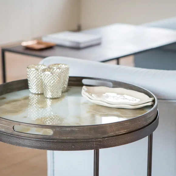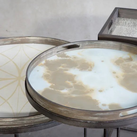 Distinctive Et Luxueuse, La Collection De Plateaux Mystic Gold Illumine Instantanément Un Espace Avec Ses Couleurs Ensoleillées, Ses Motifs Modernes Et Ses Éclats D’Or Revigorants. Le Contraste Entre Ses Jantes En Bois Sombre Et Ses Bases En Verre Brillant Met Encore Plus En Évidence Les Teintes Exquises D’Or Qui Prévalent.