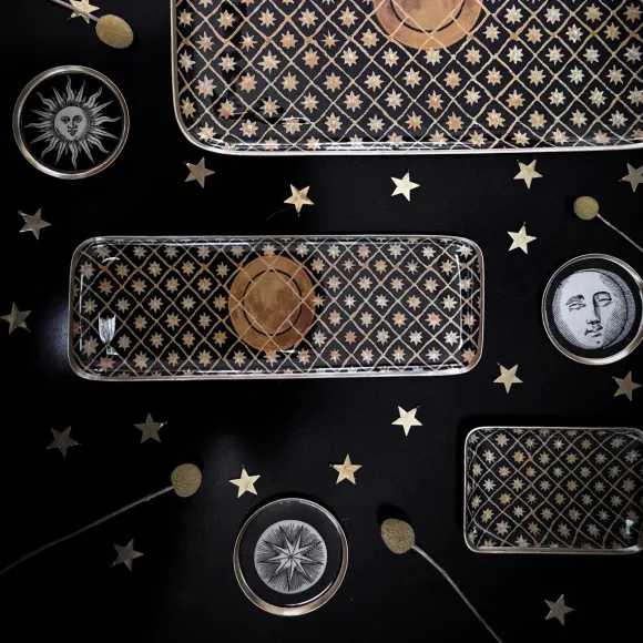 Plongez Sous Un Ciel Étoilé Avec Le Plateau Solo Céleste De La Marque Française Boncœurs !Ces Motifs Cosmiques Aux Tons Ocres Associés Au Fond Noir Du Plateau Ainsi Qu’À Sa Bordure Dorée Apportent Chaleur Et Élégance À Cette Création. Ce Plateau Est L’Accessoire Parfait Pour Servir Vos Invités, Avec Raffinement, Pendant Les Fêtes.
