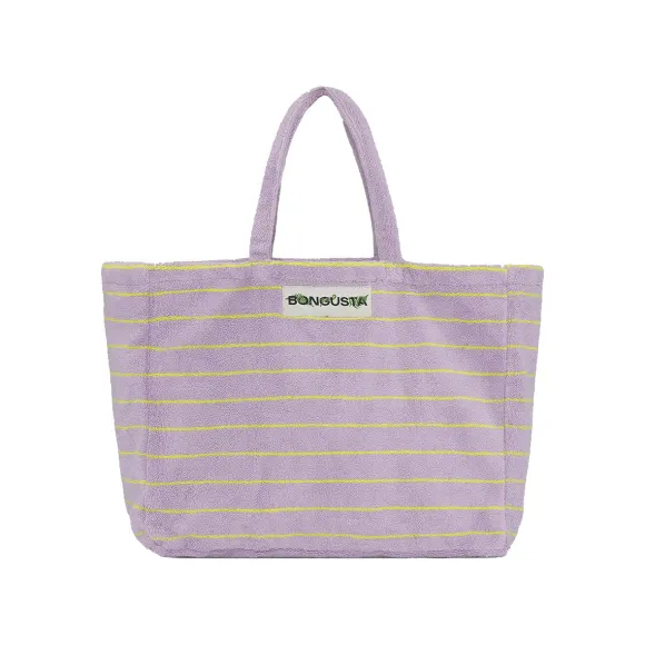 Un Nouveau Sac De Week-End Spacieux Pour Contenir Toutes Vos Affaires ! Imaginé Dans Des Rayures Lilac &Amp; Neon Yellow Et Fabriqué En Tissu Éponge Doux, Le Sac De Week-End Est Très Doux Grâce Au Tissage De Coton Peigné Lourd De 600 Grammes. Chaque Sac A Une Belle Étiquette Bongusta Brodée Sur La Partie Supérieure.
